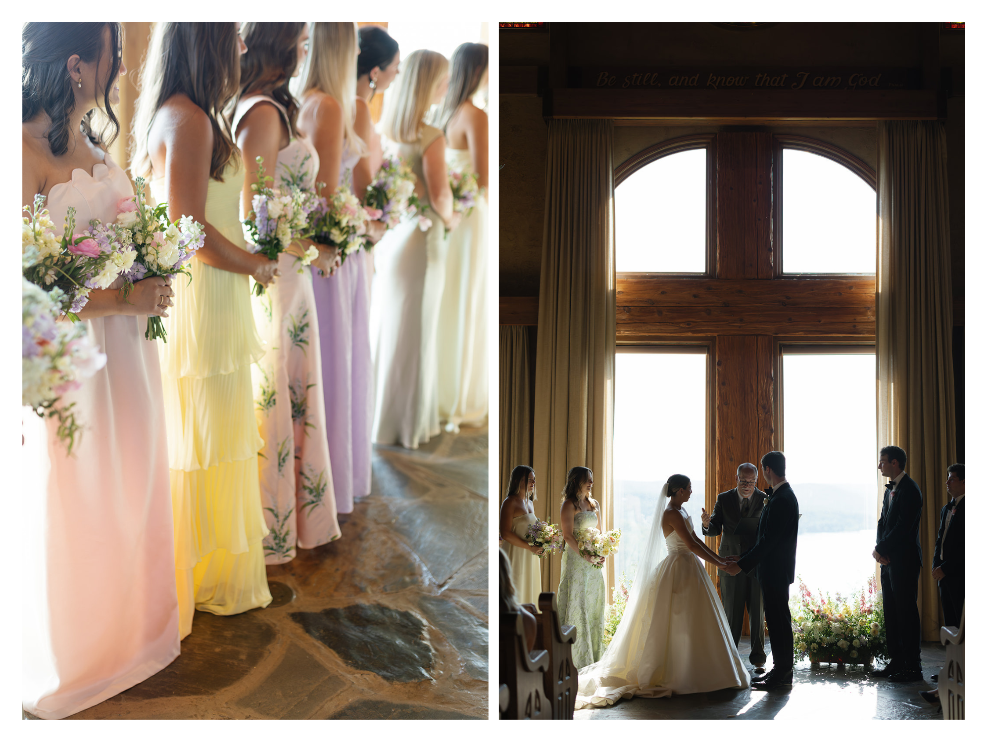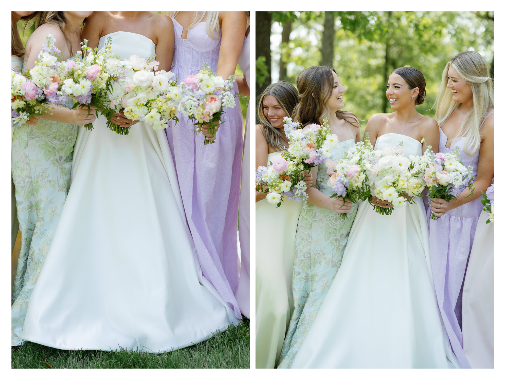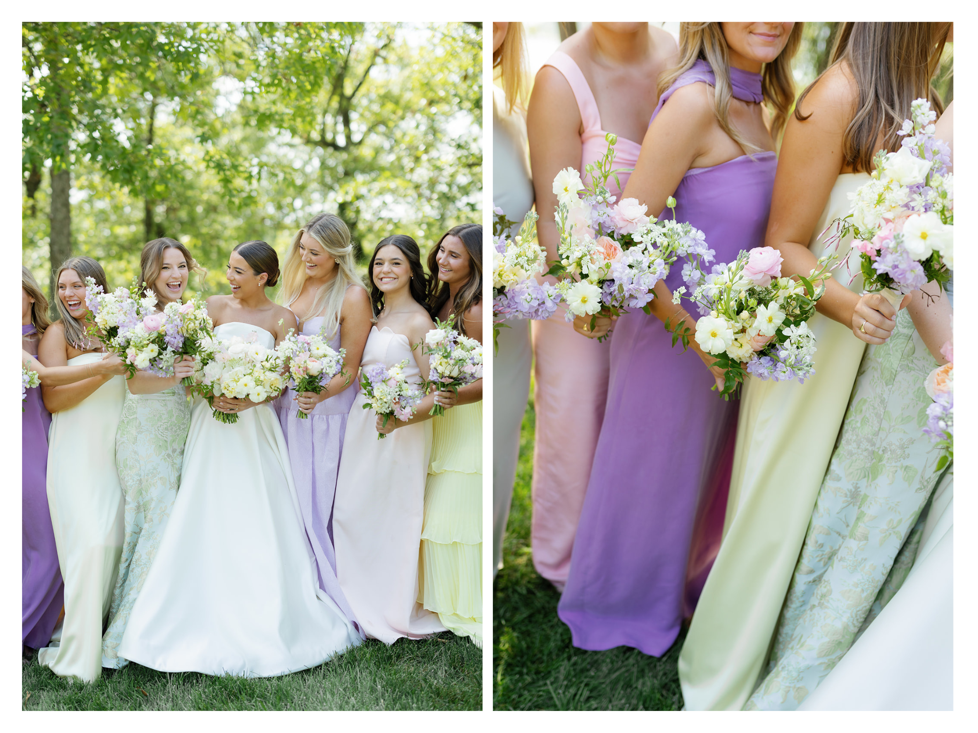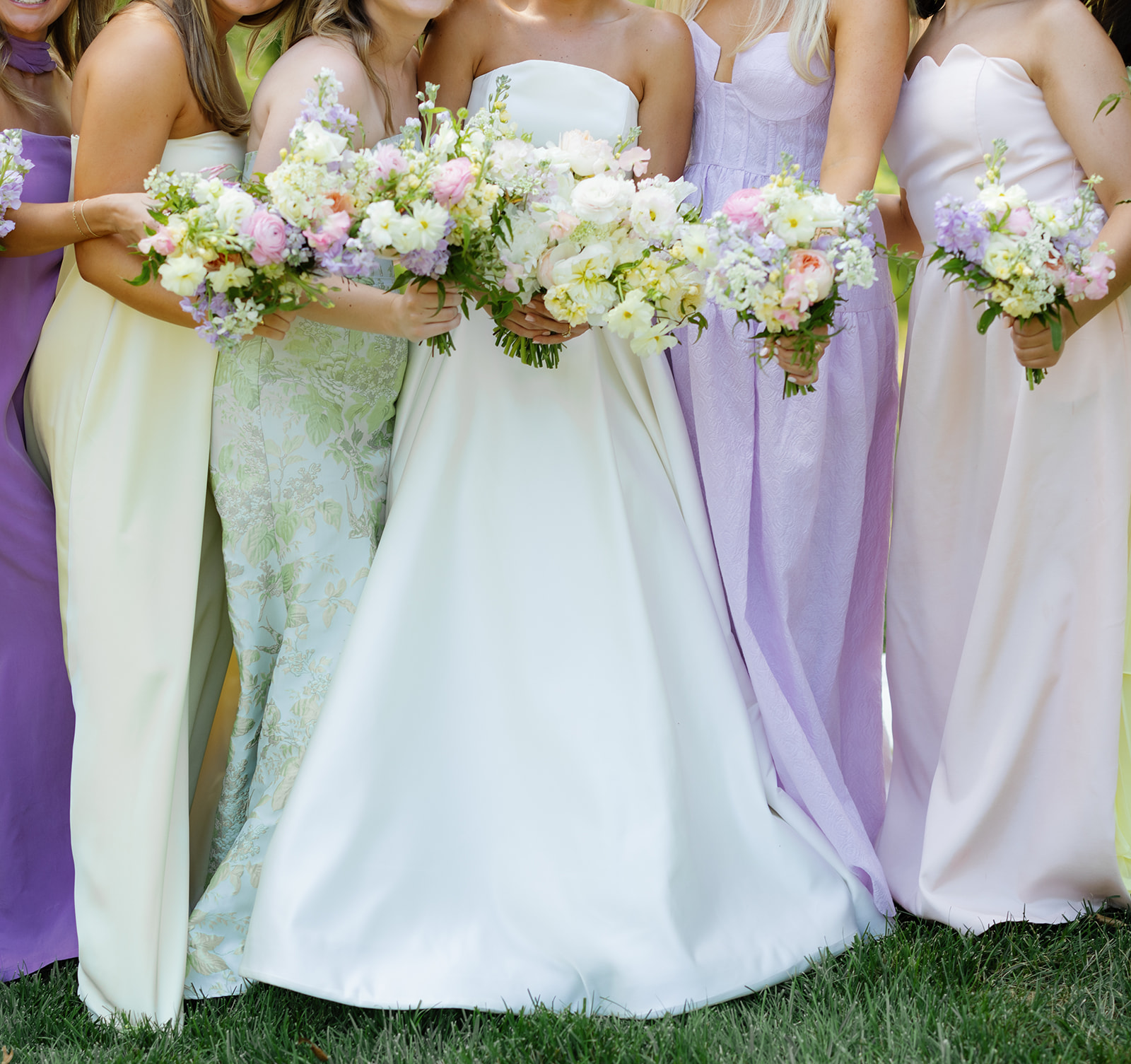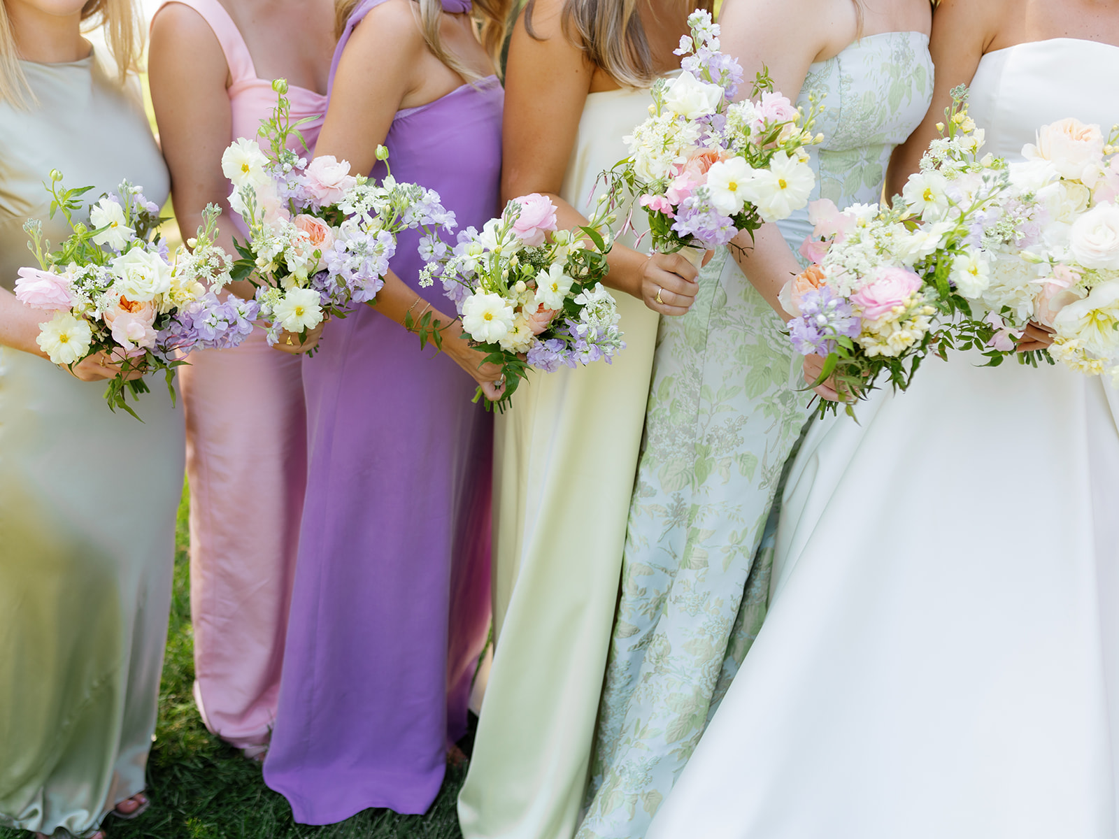 The bridesmaids wore mix-and-match dresses in solid colors and patterns of yellow, pink, green, and lavender, creating a harmonious and playful look that paired perfectly with their bouquets.