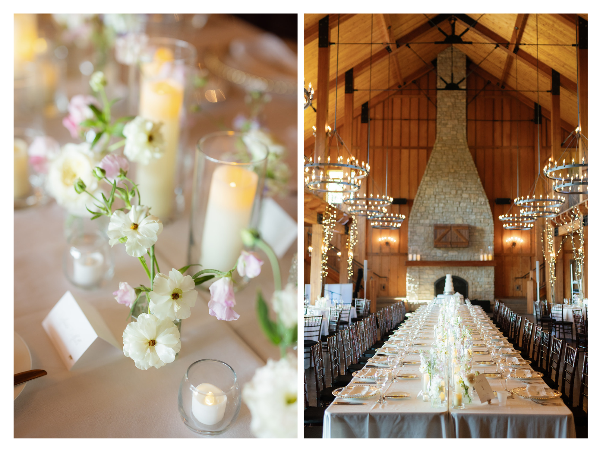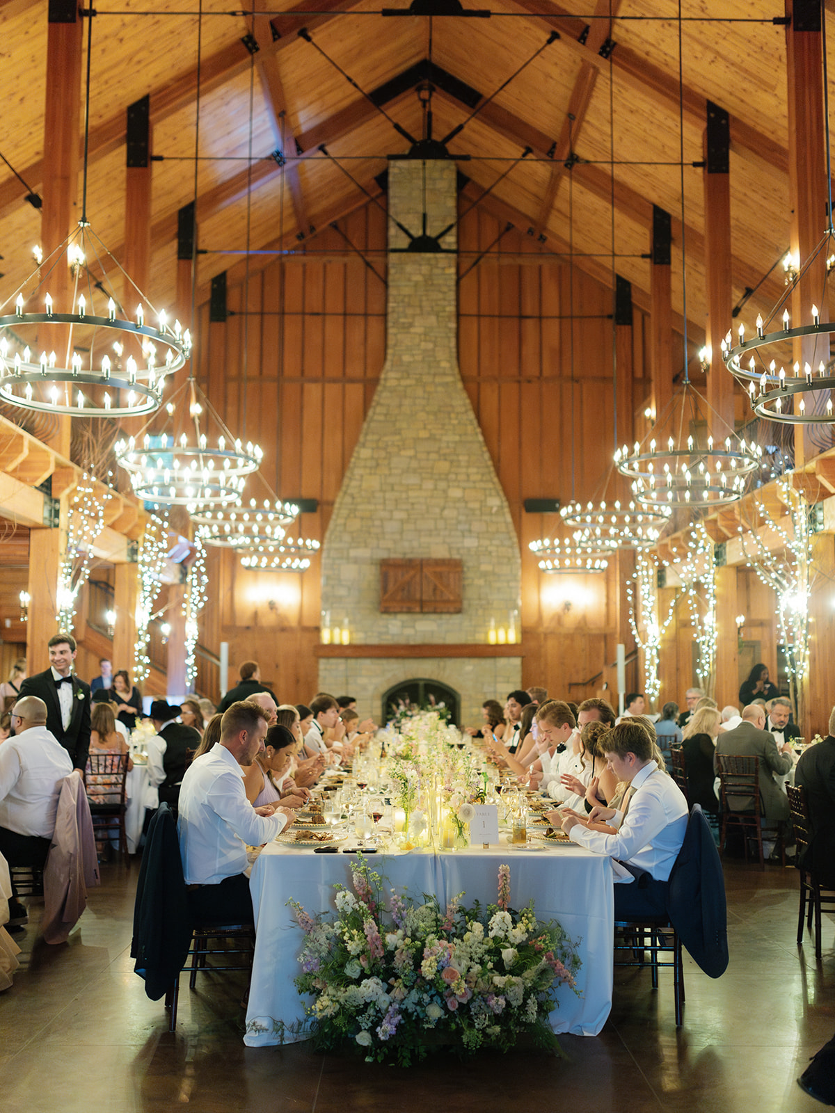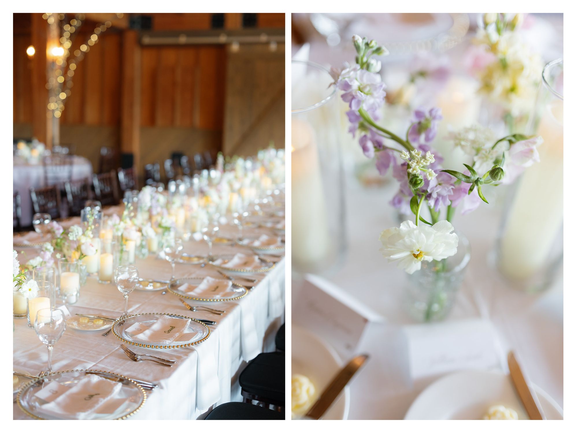 Julia wanted the head table to be the centerpiece of the reception at the Integrity Hills Stables. She dreamed of a setup that felt full, dreamy, and magical. To bring her vision to life, we lined the table with countless floral bud vases. The addition of thick candles, provided by the couple, created a cozy, ambient glow that beautifully highlighted the blooms.