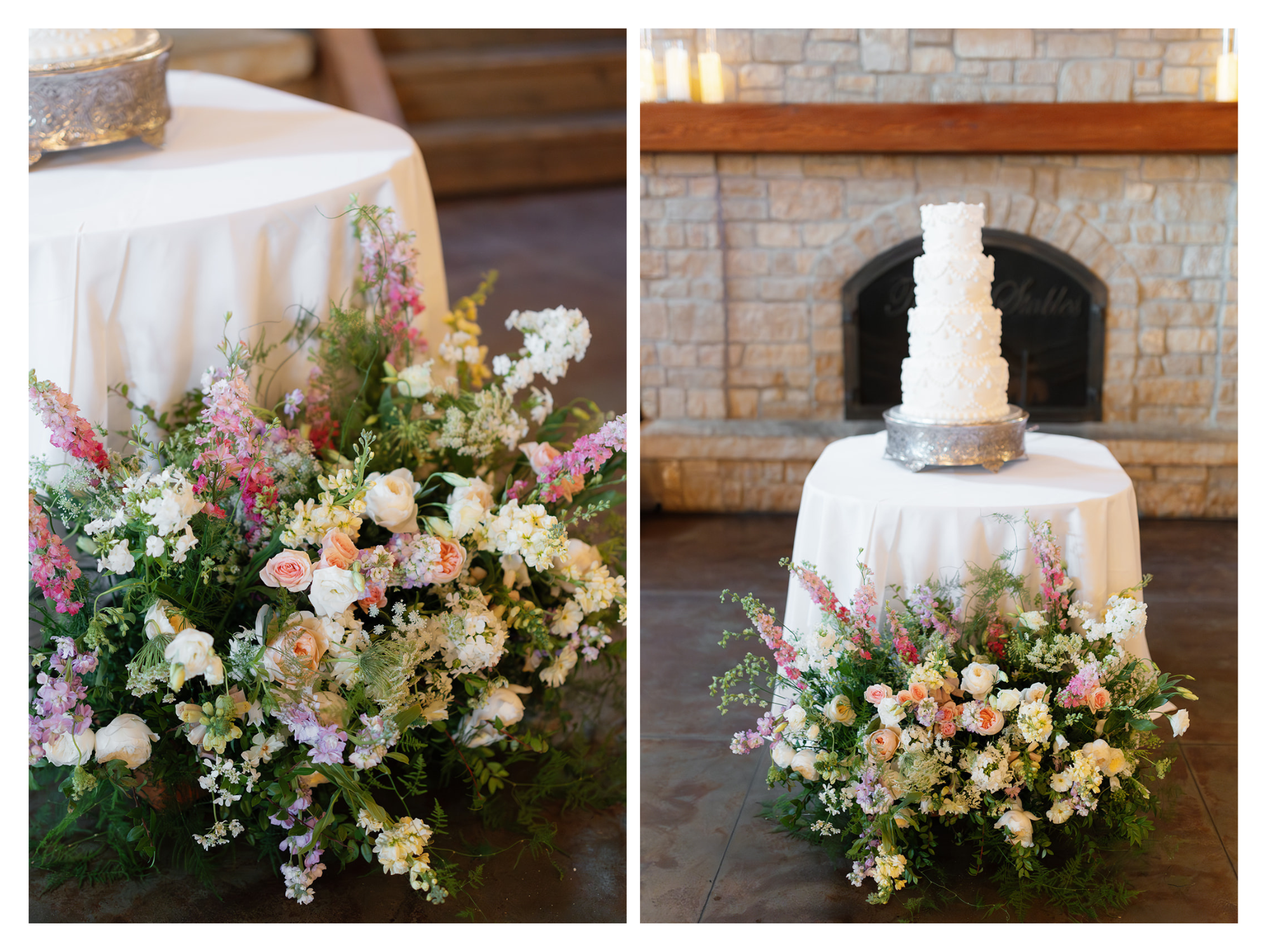 For the ceremony at the Integrity Hills Chapel, we designed whimsical floral ground arrangements to complement the space's natural beauty. The designs were intentionally organic, making them feel as though they were blooming right from the earth. After the ceremony, these stunning arrangements were repurposed for the reception at the Stables, gracing the head table and the cake table. This thoughtful reuse allowed the florals to shine in multiple settings and added a cohesive touch to the day’s design.